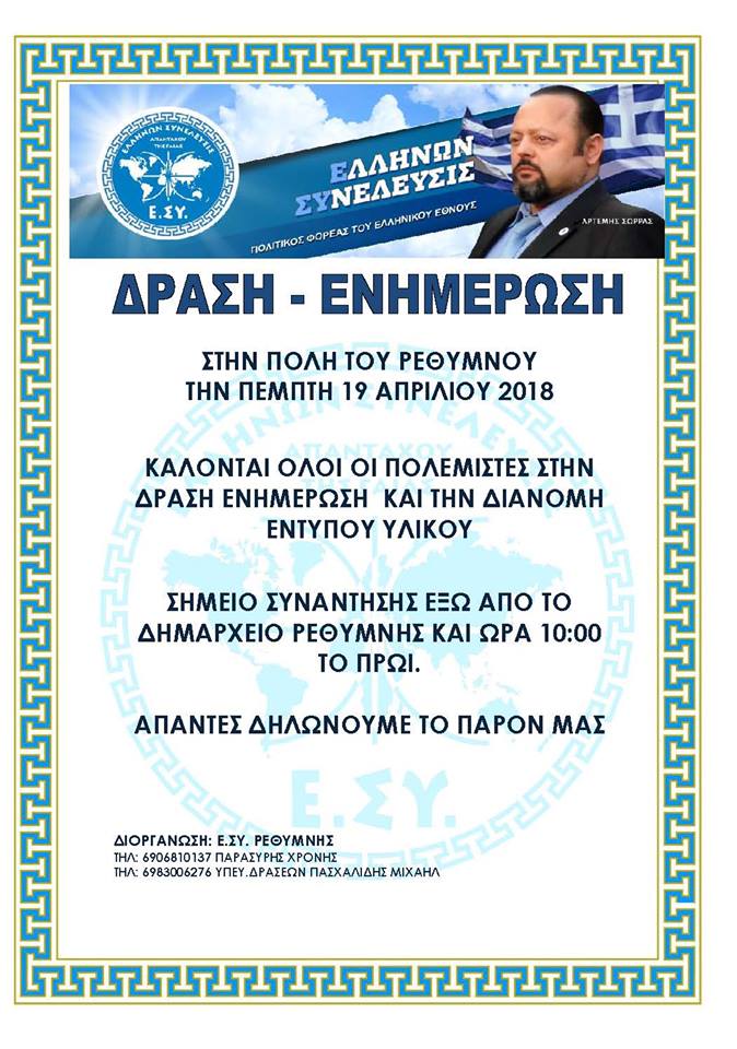 Read more »ΔΡΑΣΗ - ΕΝΗΜΕΡΩΣΗ ΣΤΟ ΡΕΘΥΜΝΟ ΤΗΝ ΠΕΜΠΤΗ 19 ΑΠΡΙΛΙΟΥ 2018 ΚΑΙ ΩΡΑ 10:00 Π.Μ. ΘΑ ΠΡΑΓΜΑΤΟΠΟΙΗΘ…